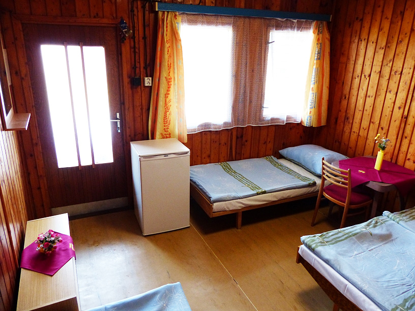 Nabízíme levné ubytování v chatkách pro dvě až čtyři osoby. V chatkách jsou klasická lůžka nebo palandy, skříň, stolek a botník, lednice.