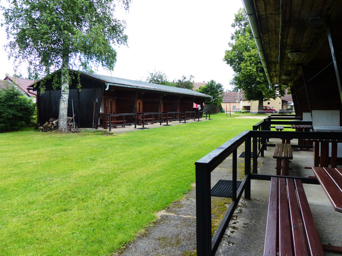 Před každou chatkou je možnost venkovního posezení pod střechou. Vedle posezení je umístěna venkovní kuchyňka bez el. spotřebičů. Ty si můžete přivést vlastní.